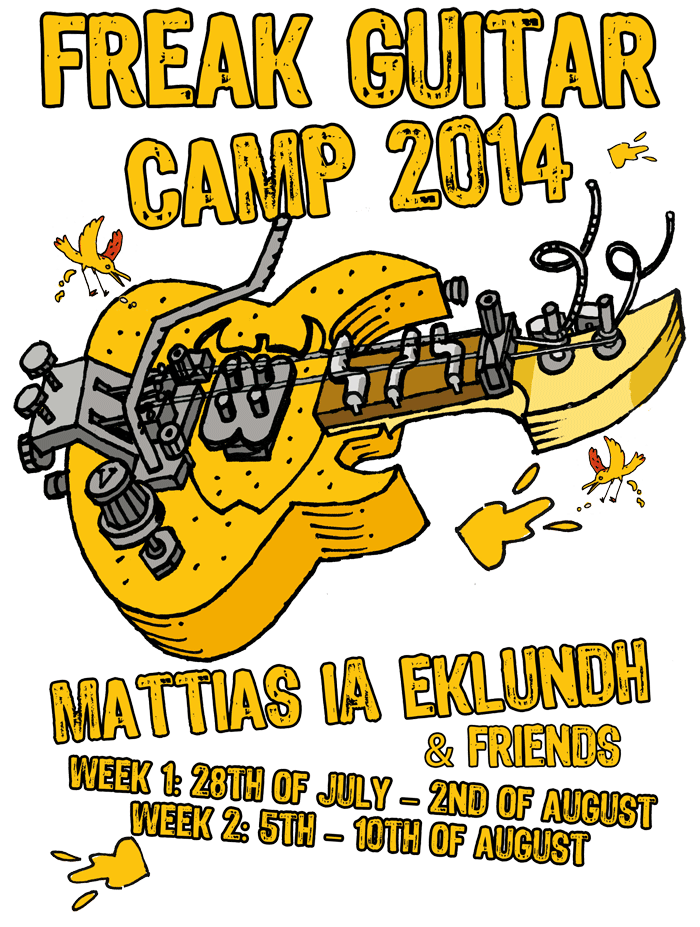 As if this wasn't enough, other prominent guest musicians will also visit the Freak Guitar Camp when you least expect it… Many fabulous players have come the camp to play, teach and simply chill out. (Kiko Lourerio, Bumblefoot, Guthrie Govan, Christophe Godin, Vic Zino from Hardcore Superstar, Stian Carstensen, Niclas Engelin from In Flames and Engel, Panzerballet's Jan Zehrfeldt, Andreas Öberg, Mr. Fastfinger, Kee Marcello, Mats/Morgan, Andy James, Dick Lövgren from Meshuggah, Fredrik Åkesson from Opeth, Jonas Hellborg, Angry Loner, Selvaganesh Vinayakram and many more). So be it again. IA is talking to a number of interesting collegues that might show up! The camp is held just outside Gothenburg, Sweden, at a place called Härsjösand, located exactly in the middle of nowhere. (Closest airports are Landvetter International Airport and Gothenburg City Airport. You can also get to Gothenburg by ferry, train or bus. We will pick you up. The dare devil might want to drive on his/her own. A detailed map will be provided to prevent you from getting lost in the wilderness). Among many things, the beautiful surroundings include a nice lake great for various H2O-activities (read: swimming, if you're into that) between the frantic classes, something you might need since at least 10 hours in the class room each day is to expected! After an intense day's work there is time for practice and if you're lucky you just might catch a couple of hours of well-deserved sleep! Does this sound challenging to your physical and mental state of mind/body? You bet it is! But do not fear; everyone (as far as we know) leave the camp strengthened (if somewhat exhausted). In fact, many of our former students come back year after year and vividly tell that the Freak Guitar Camp has been one of the best experiences of their lives! Once a Freak Guitar Camper, always a Freak Guitar Camper. Besides all the classes, the registration fee includes all the course material, a bed at night (nothing fancy but you won't do much sleeping anyway!) and splendid, nutritious food cooked by our own professional Freak Guitar Camp Cook, the one and only Fiffi Tjusling! All this and plenty more is included at the price of 6000 Swedish crowns (approx. 880 US $/720 €/620 £)! Is this something for you? Are you brave enough? In need of a vitamin injection in your playing (and life)? Do you like progress and detest stagnation? To sign up, please read the following carefully: Applications to the camp are to be sent by e-mail to fgc@freakkitchen.com and are committing. In other words: since we have many more interested in the camp than we have room for, please make totally sure that you can come to Sweden this summer before signing up. The mail shall state your full name and address and shall clearly say what week you want to attend. When you have sent an application to the address above you will shortly thereafter receive a mail with additional information, a couple of questions and instructions. If you have questions concerning the camp, don't hesitate to drop us an e-mail! Hope to see you August 2014! The Freak Guitar Camp Crew |