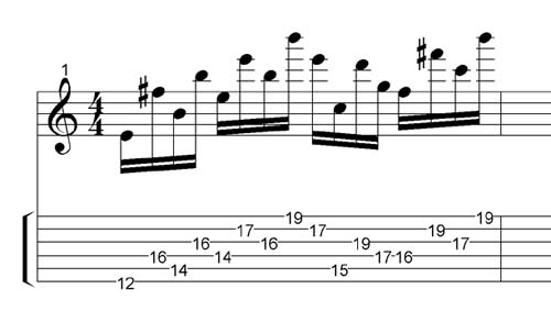 16:th fret (B) again and stretch to the high e-string´s 19:th fret (B). This is